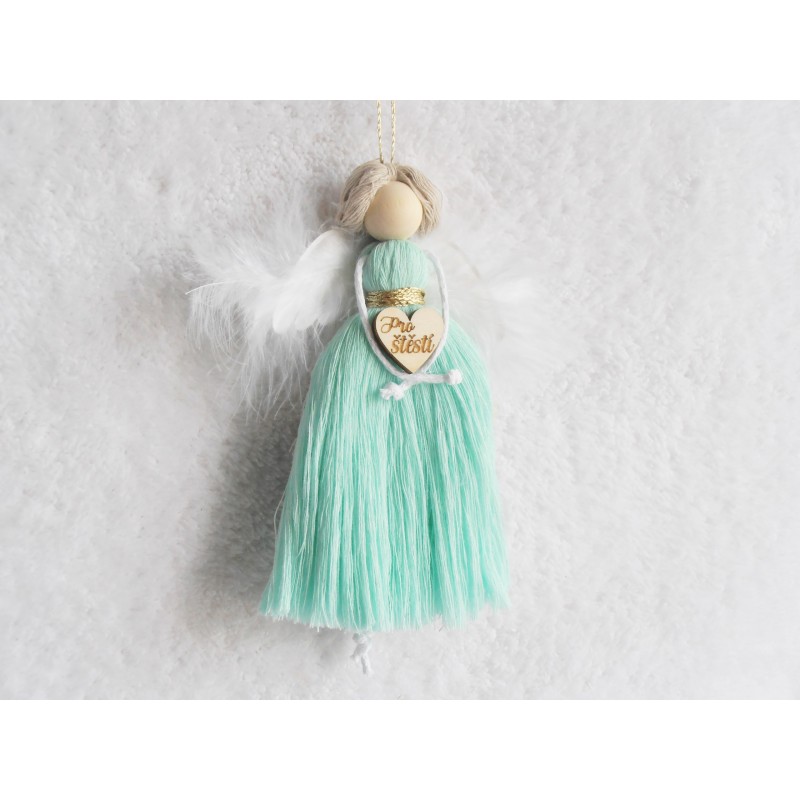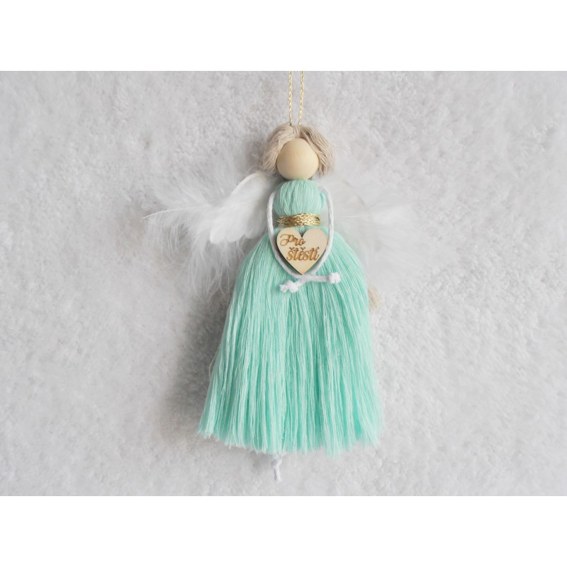 Andělka z macramé příze v barvě mint, držící srdíčko s nápisem ,, Pro štěstí,, dárkově balená