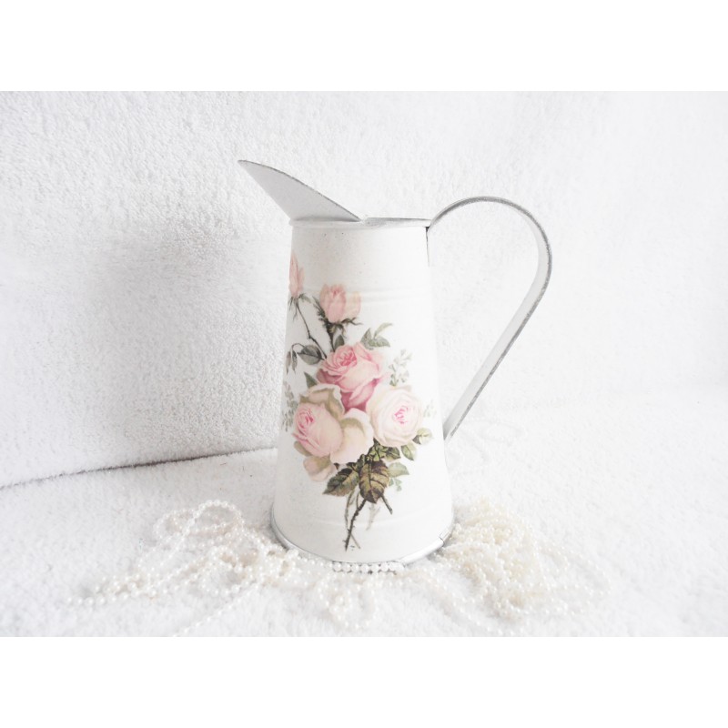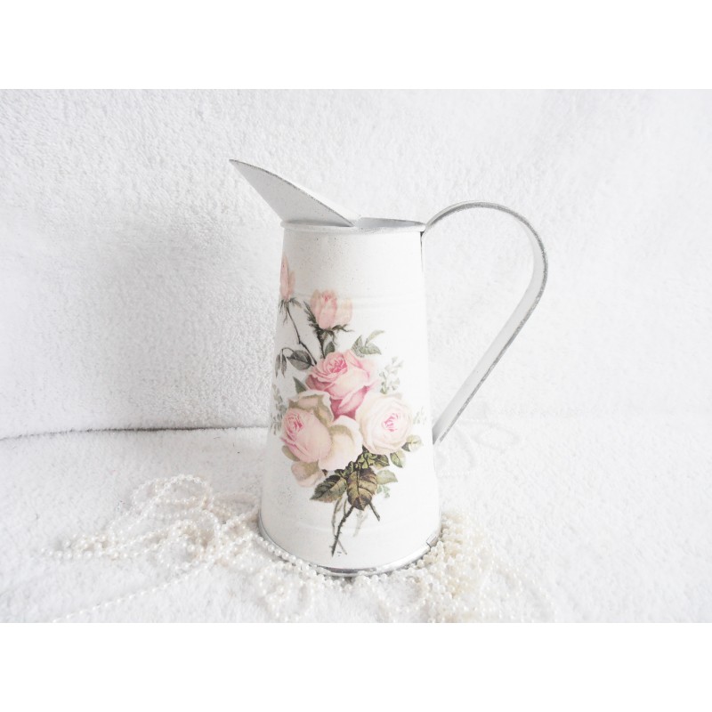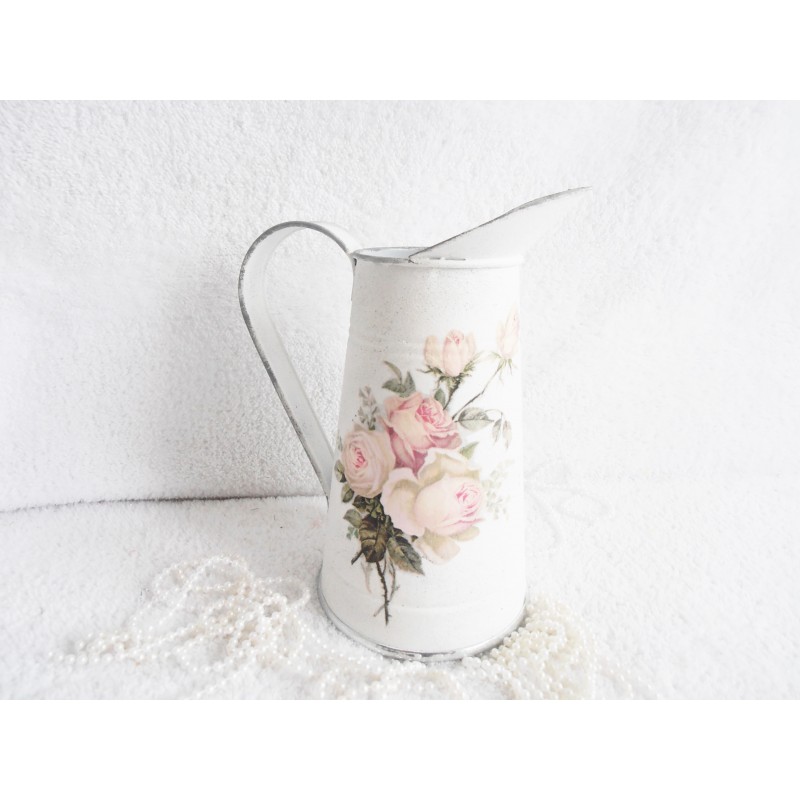 Džbánek kovový z pozinkovaného plechu v bílé barvě, zdobený kyticí vintage růží , po okrajích