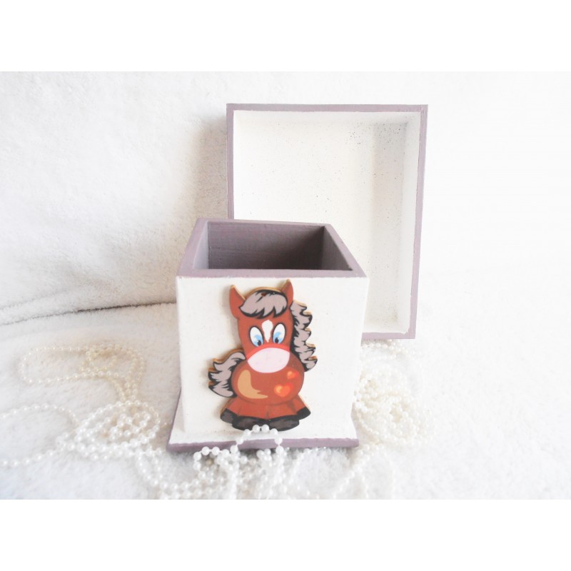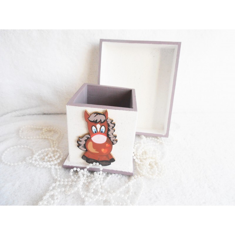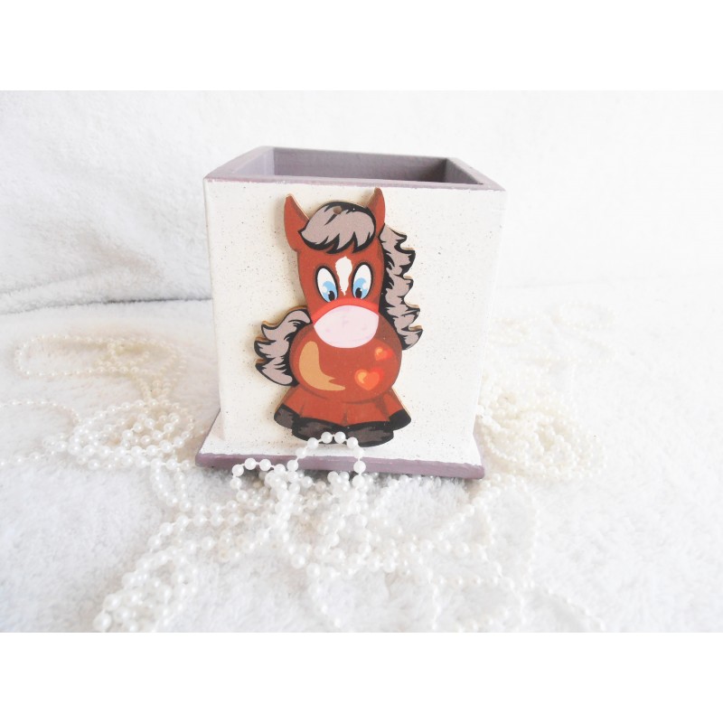 Sestava dřevěného stojánku a krabičky na psací potřeby s výřezek koníka, základní barva je bílá,